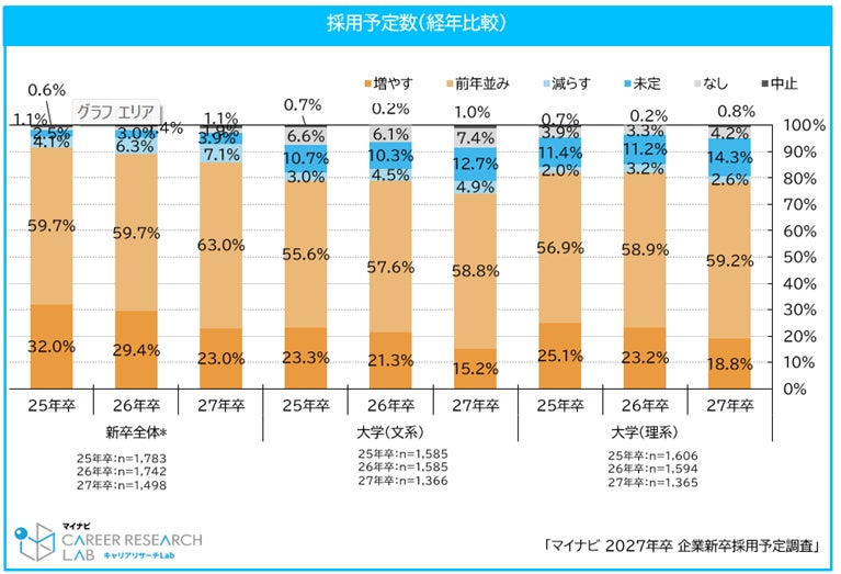 株式会社マイナビ(本社:東京都千代田区、代表取締役 社長執行役員:粟井俊介)は、「マイナビ2027年卒 企業新卒採用予定調査」を発表しました。本調査は、企業の新卒採用に対する意識や採用活動全体の動向を把握することを目的に、2001年(2002年卒)以来、毎年実施しています。