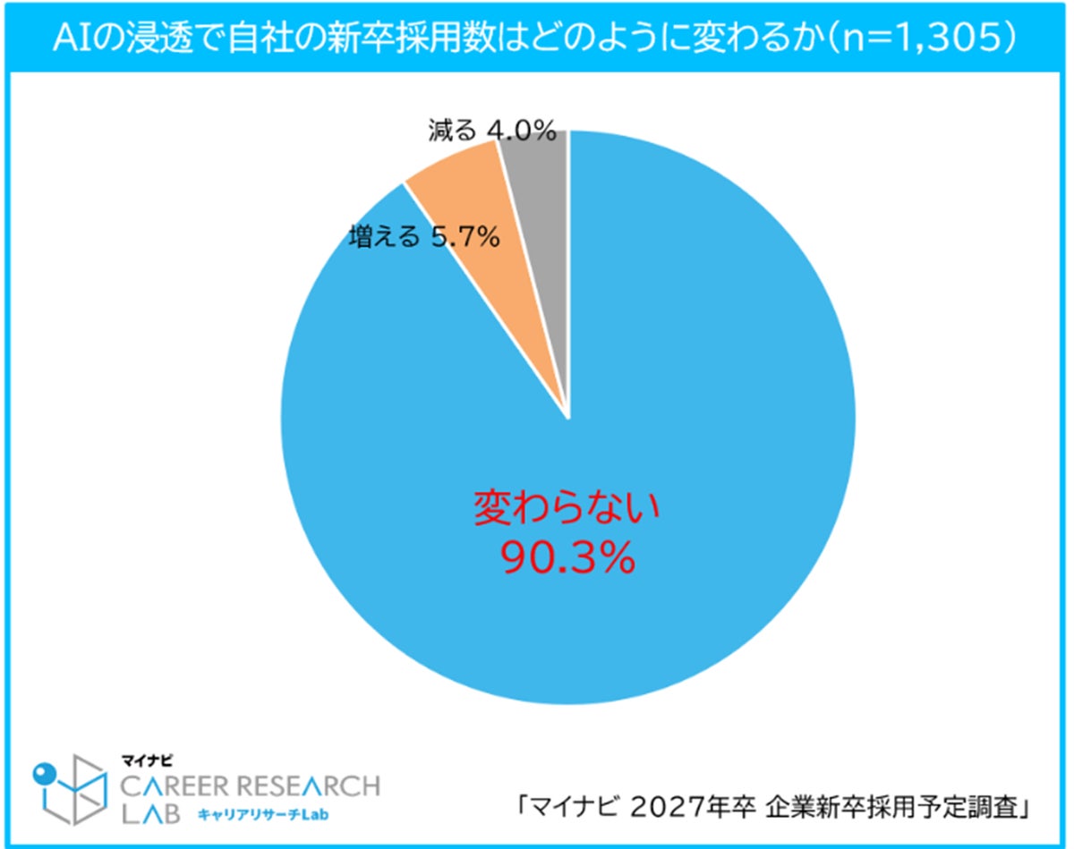 27年卒の採用予定数を増やす企業は23.0%で前年から減少。初任給引き上げを予定する企業は55.4%。9割以上の企業はAIが浸透しても新卒採用数は変わらない