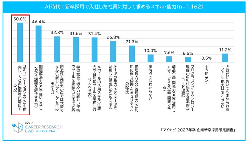 AIが浸透するなかで自社の新卒採用数はどのように変わるかを聞いたところ、「変わらない」が90.3%で最多だった。AI時代において、自社で新卒採用を行う理由を聞くと、最も多かったのは「若手人材の長期育成を重視しているため」(65.1%)で、「将来の幹部候補を確保するため」(48.8%)、「組織文化や価値観の継承が必要だから」(43.7%)と続いた。企業の持つ文化や価値観を継承するために、将来のコア人材となる社員の採用と、そうした人材の長期的な育成が必要だと考えている企業が多いようだ。またAI時代に新卒入社社員に求めるスキルや能力については「コミュニケーション力(AIを補完し、人との協働を円滑にする力)」(50.0%)が最も多く、対人的なコミュニケーションや関係構築に関するスキルを重視する企業が多いことがわかる。【図6、7、8】