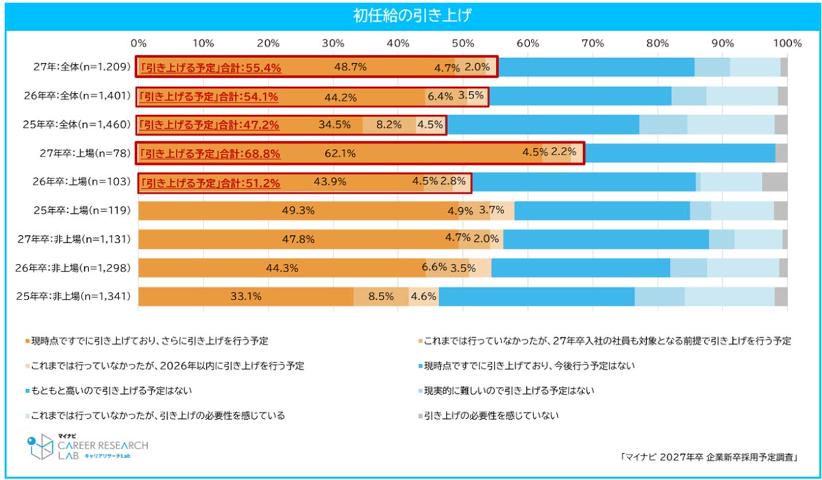 初任給の引き上げについて聞くと、今後引き上げを行う予定の企業は55.4%で、前々年(25年卒)の47.2%、前年(26年卒)の54.1%からさらに増加した。上場企業では68.8%と前年(51.2%)より17.6pt増となり、積極的な引き上げの意向がみられた。