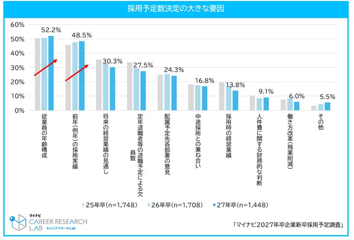27年卒の採用予定数を増やすとした企業は全体(23.0%)・文系(15.2%)・理系(18.8%)となり、前年から減少した。一方、前年並みと回答した企業は全体(63.0%)・文系(58.8%)・理系(59.2%)で増加した。採用予定数を決定する大きな要因として最も多かったのは「従業員の年齢構成」(52.2%)で、次いで「前年(例年)の採用実績」(48.5%)となり、いずれも2年連続の増加となった。前年(26年卒)は採用充足率が過去最低で、新卒採用において苦戦を強いられている企業が多くなっているなか、採用数を増やすのではなく現状維持とする企業が増えていると考えられる。【図1、2】