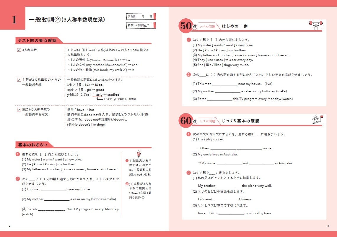 本書の最大の特長は、“目標点数に合わせて効率的に学習できる”、目標点別の問題構成にあります。まずは基礎を固めて「70点」を目指したい人は、「基本のおさらい」から順に「70点レベル問題」までを丁寧に解くことで、着実に得点力をアップできます。「90点以上」を狙う人は、「基本のおさらい」~「60点レベル問題」まではさっと確認する程度にとどめ、「70点レベル問題」から「80~90点レベル問題」を中心に演習することで、テスト前の限られた時間を最大限に活用できます。自分の目標点に応じて重点的に取り組む問題を選べるため、無駄なく、効率よく学習を進めることが可能です。