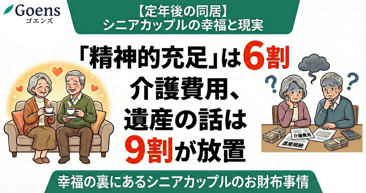 50歳以上限定のマッチングアプリ「Goens(ゴエンズ)」(運営:Goens株式会社/本社:愛知県名古屋市/CEO : 廣澤 和也)は、50歳以降に現在のパートナーと同居を開始し、年金収入を主として生活する65歳以上の男女(事実婚・法律婚問わず)を対象に、その生活実態についてアンケート調査を実施しました。