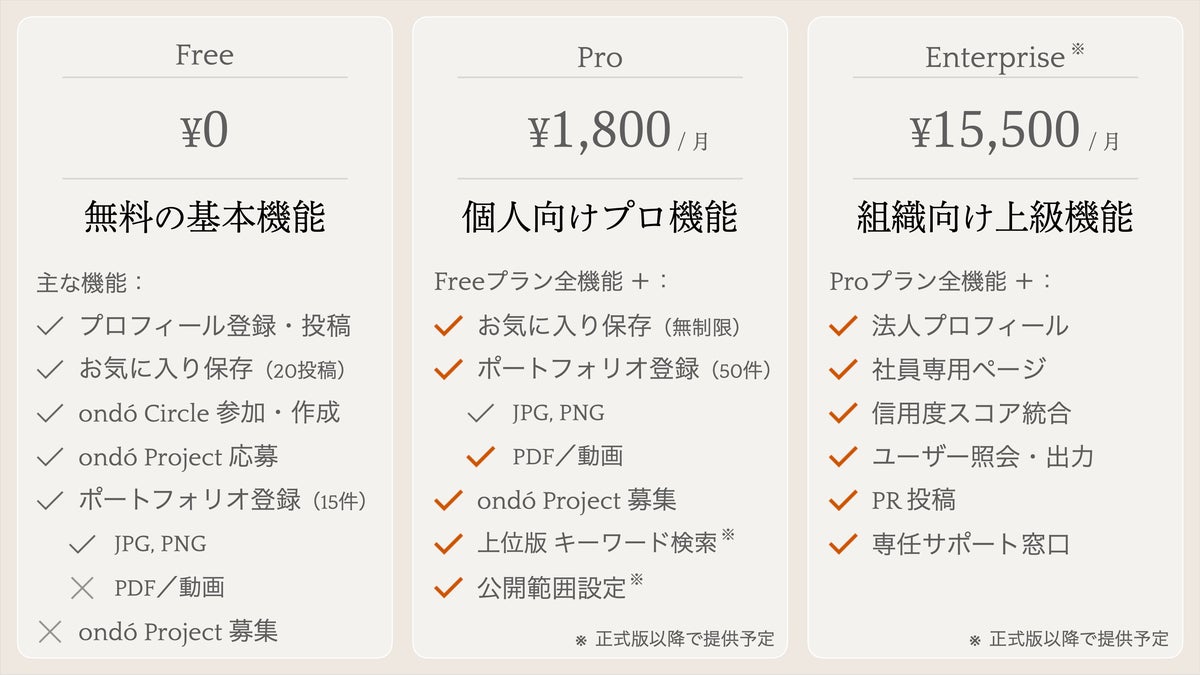 一人でも多くのプロフェッショナルに使っていただきやすいように、「ondo」の基本機能は全て無料で提供いたします 。さらに今回、β期という早い段階から関心や期待を寄せていただいた共創メンバーの皆さまには、「ondo」を最もお得に、そしてフルにご活用いただける恒久的な先行者特典をご用意しています。特典の詳細については、事前登録いただいた方にだけ限定案内しておりますので、ぜひこの機会をお見逃しなく。
