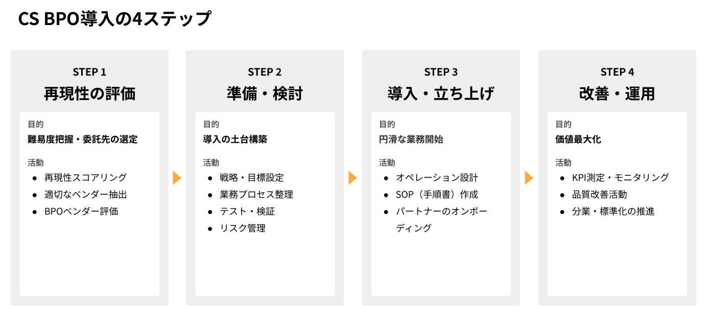 CS BPOのライフサイクルを「1.再現性の評価」「2.導入前の準備・検討」「3.導入時の立ち上げ」「4.導入後の改善・運用」の4フェーズに分け、各フェーズで実施すべきタスクや考慮事項を詳細に解説します。