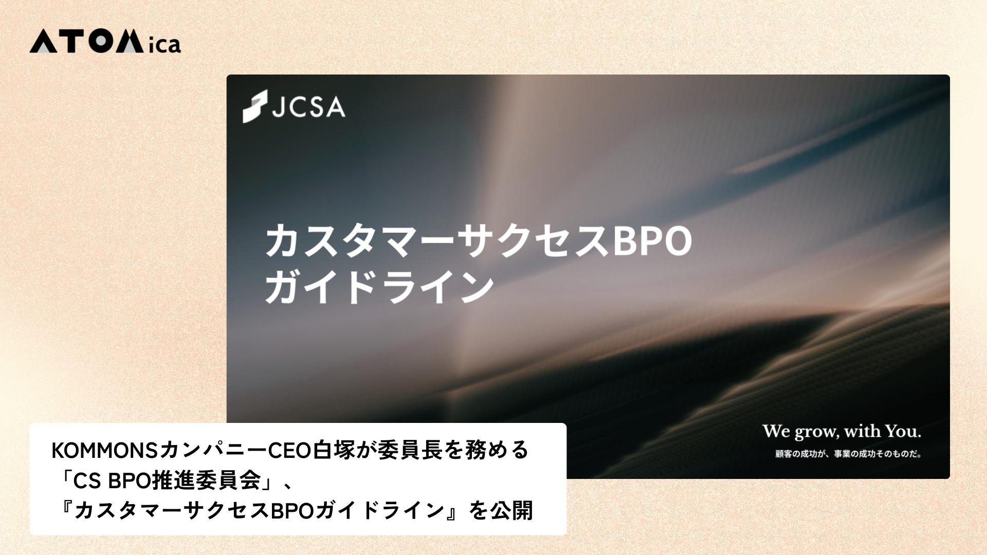 株式会社ATOMica(本社:宮崎県宮崎市、代表取締役Co-CEO:嶋田 瑞生、南原 一輝、以下ATOMica)は、同社内カンパニーKOMMONSのCEO・白塚 湧士が委員長を務める、「一般社団法人日本カスタマーサクセス協会 CS BPO推進委員会」が、企業におけるカスタマーサクセス(以下CS)業務の外部委託を戦略的に推進するための実践的な手引書『カスタマーサクセスBPOガイドライン』を、2026年2月18日より同協会公式サイトにて公開することをお知らせします。