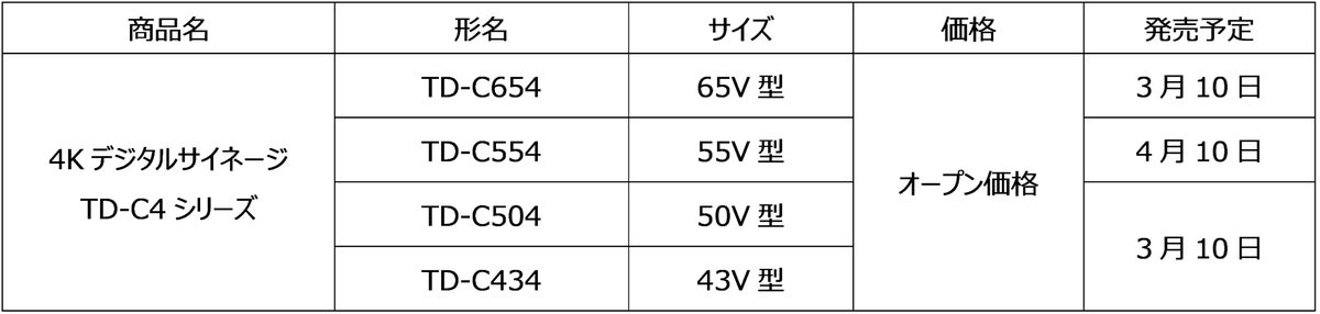 TVS REGZA株式会社は、業務用4Kディスプレイのエントリーモデル「TD-C654」「TD-C554」「TD-C504」「TD-C434」(以下TD-C4シリーズ)を3月10日から順次発売いたします。「TD-C4シリーズ」はエントリーモデルでありながらノングレアパネルを採用することで優れた視認性を実現し、店舗や施設での案内表示・情報発信、ならびにオフィスでの会議や情報掲示板用途など、幅広いサイネージ用途に適した業務用ディスプレイです。サイズも65V型から43V型まで4種類を取りそろえており、用途に応じたサイズをお選びいただけます。