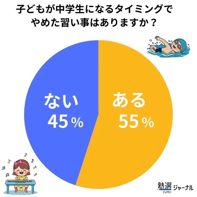 アンケート結果を見ると、55%の家庭が「やめた習い事がある」と回答しました。中学校入学のタイミングで、半数以上の家庭が習い事を見直していることが分かります。