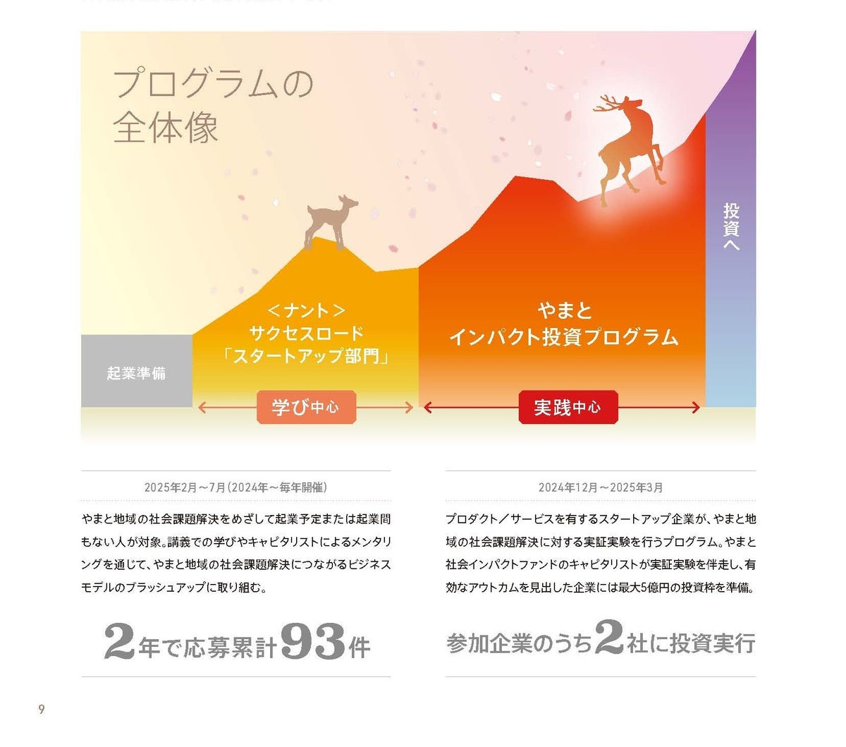 このプログラムは、創業前後の起業家を対象とする「〈ナント〉サクセスロード スタートアップ部門」と、既に地域の社会課題解決に資する事業拡大フェーズのスタートアップを対象とする「やまとインパクト投資プログラム」で構成されており、ビジネスモデルのブラッシュアップから実証実験の支援、投資実行に至るまで、一貫して起業家の皆さまの伴走支援を行うものです。