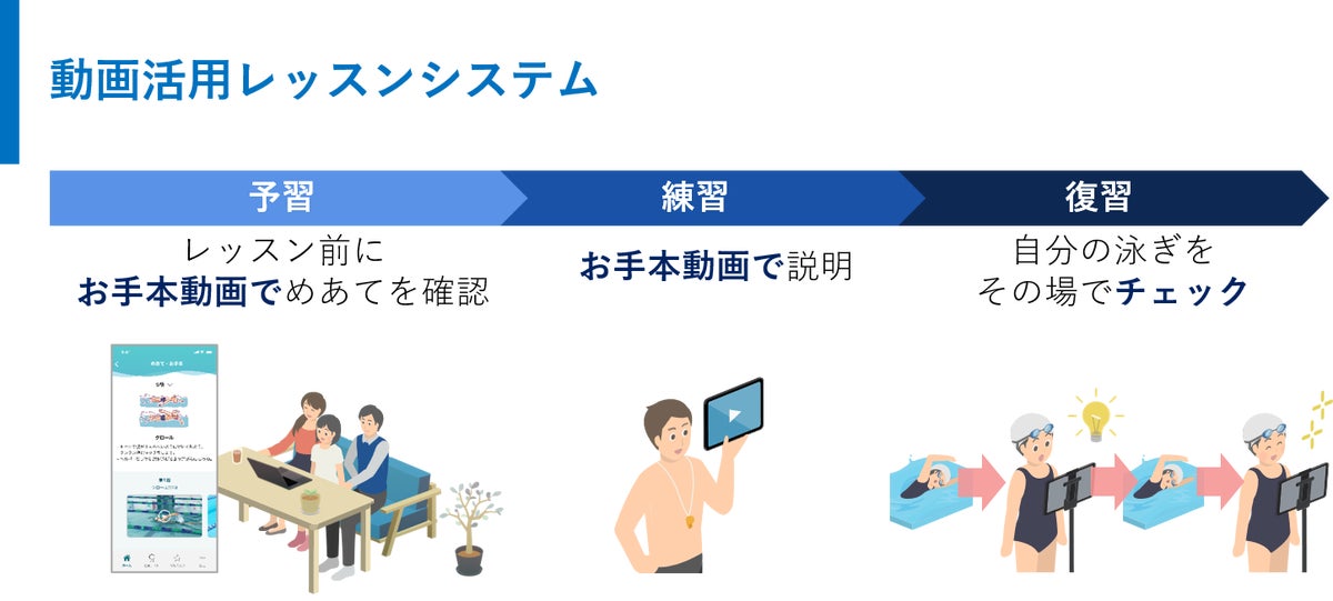 レッスン中の動画データをもとに、お子さま自身が自分の泳ぎを客観的に確認できることで、「どうすれば もっと速くなるか」などの改善点を見つける主体的な学びが促進されます。また、言葉だけではイメージしづらい指導内容も理解しやすくなります。