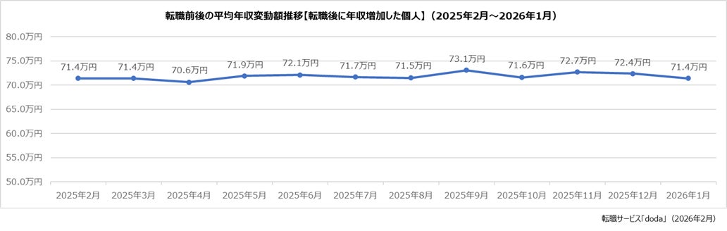 転職前後の平均年収変動額【転職後に年収増加した個人】:+71.4万円(前月差:-1.0万円)