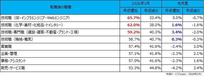 転職後に年収増加した個人が多かった職種は、「技術職(SE・インフラエンジニア・Webエンジニア)」(65.7%)、次いで「技術職(化学・素材・化粧品・トイレタリー)」(62.0%)、そして「技術職・専門職(建設・建築・不動産・プラント・工場)」(59.2%)が続きました。