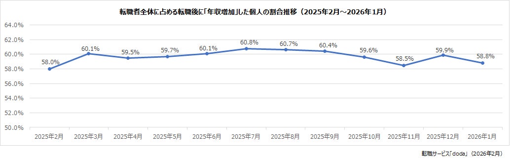 転職後に「年収増加」した個人の割合は、58.8 %(前月差:-1.1ポイント)でした。