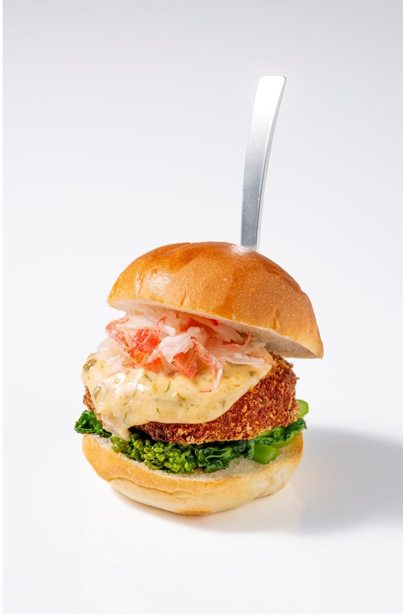 信州サーモンのコロッケに菜の花、新タマネギ、桜エビなど春を感じる食材を合わせたスライダーバーガー