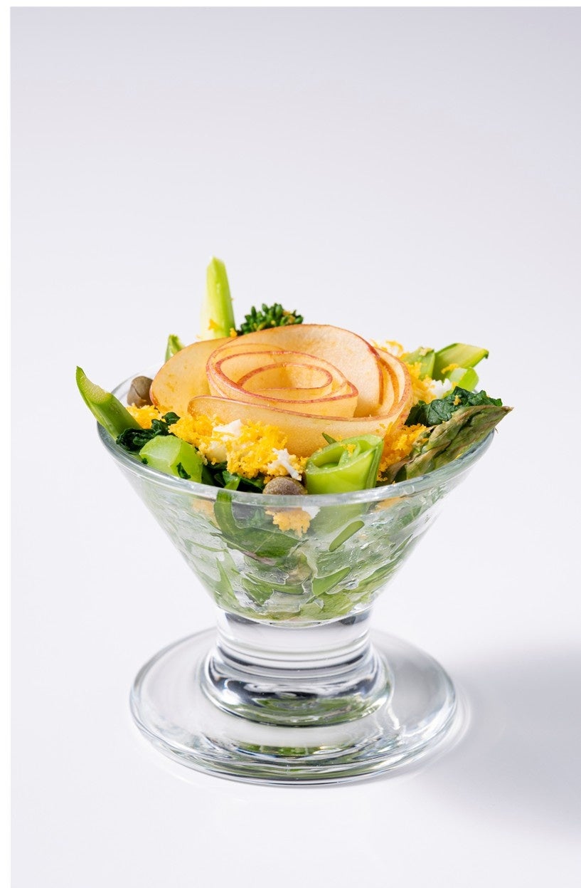 お花をかたどったリンゴに春の野菜やたまごを散らしたミモザ風サラダ
