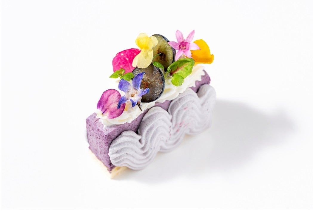 ブルーベリーのムースをムラング(フランス語でメレンゲ)でサンドし、色鮮やかなお花で飾った春らしい一品