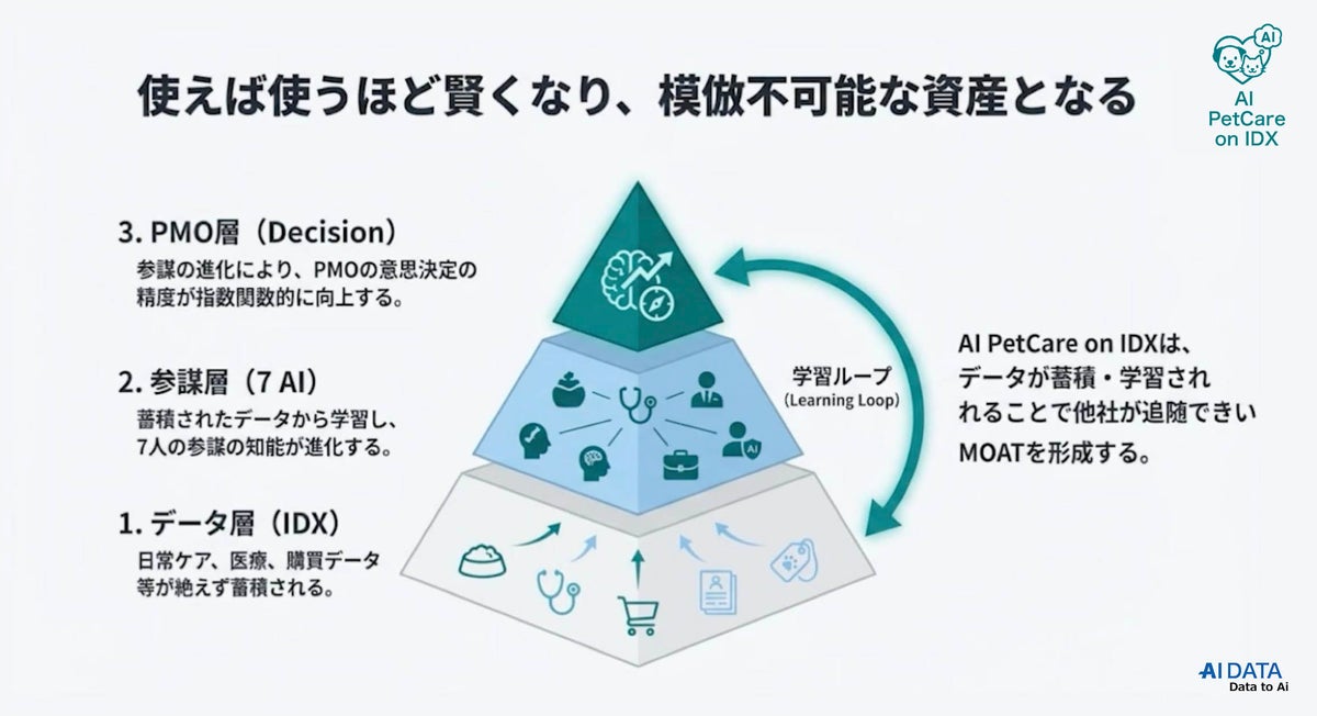 企業データとAIの利活用カンパニー、AIデータ株式会社(本社:東京都港区、代表取締役社長 佐々木隆仁、以下AIデータ社)は、ペット業界の分断化された市場構造を解決し、ペットケア全体の最適化を実現する次世代PetTech参謀プラットフォーム「AI PetCare on IDX」にAI PMO×MOAT OSが追加されたアーキテクトを発表いたします。