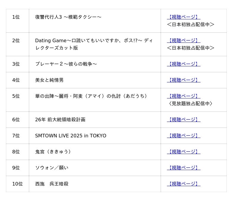 NTTドコモの映像配信サービス「Lemino(R)」は、2026年1月の韓流・アジアコンテンツの月間視聴数を集計し、「Lemino人気作品月間ランキング」を発表いたします。1月は、”模範タクシー”に乗る秘密のプロフェッショナル集団が弱者に代わって法では裁けない悪に復讐するアクションエンターテインメント『復讐代行人3 ~模範タクシー~』が3ヶ月連続で1位にランクインしました。