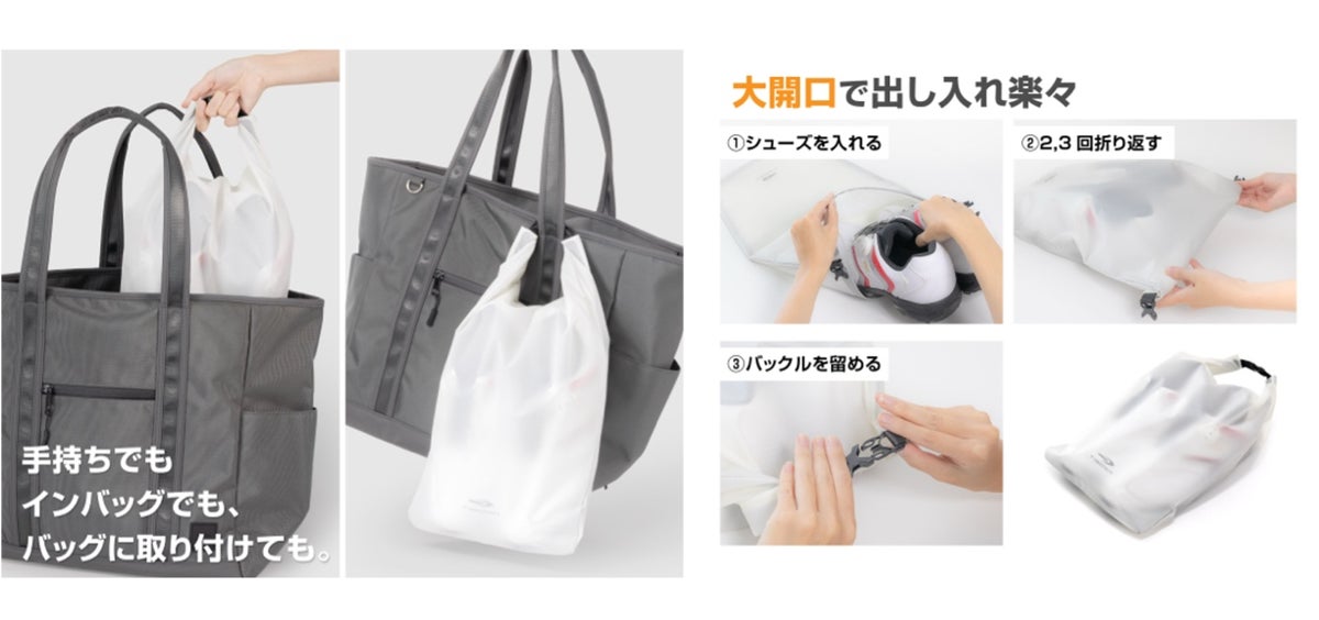 また、最大30cmまでのサイズに対応し、バスケットシューズやスパイクなどさまざまな種類のシューズを無理なく収納でき、スムーズな出し入れを可能にします。さらに、手持ち・インバッグ・バッグ取付の3通りの持ち運びに対応しており、シーンに合わせて自在に活用できます。