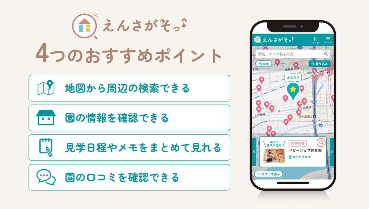 保護者は、「えんさがそっ♪」を利用することで、自宅や現在地付近の保育施設を地図上で簡単に検索できたり、気になる保育施設をお気に入り登録して後からまとめて見返せたり、お問い合わせや見学の申し込みをすることができます。授乳中や子どもが寝ている間でも、時間や場所を問わずに気軽に活用できるので、「保活」がもっとスムーズに行えるようになります。