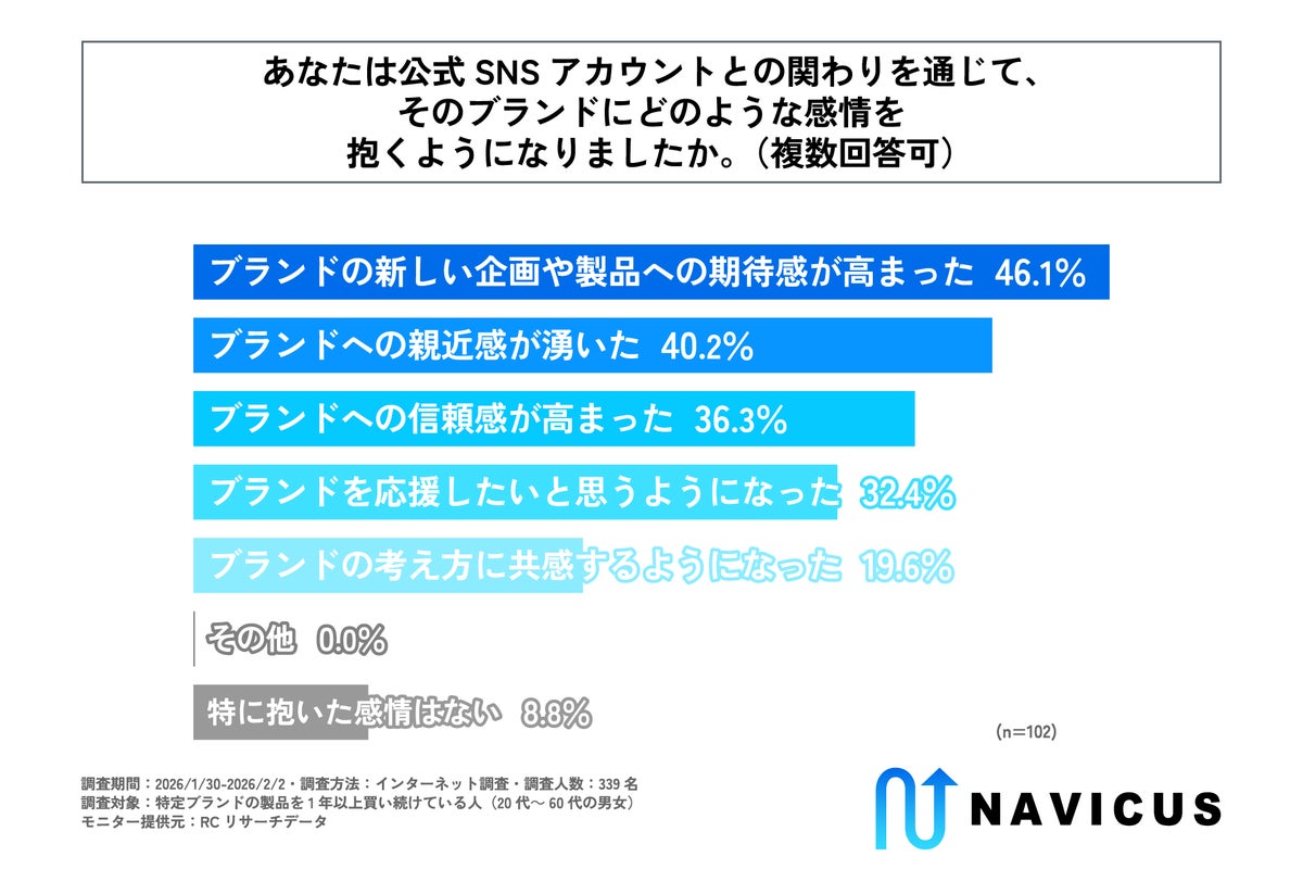 公式SNSアカウントとの関わりを通じて、そのブランドに抱くようになった主な感情は「ブランドの新しい企画や製品への期待感が高まったこと」や「ブランドへの親近感が湧いたこと」