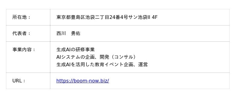 boom now社は、「We make The World boom now ~今こそ世界を盛り上げる!!~ 」をコーポレートビジョンに掲げ、変化と進化を恐れない「時代のファーストペンギン」として、企業の価値を最大化させる生成AIに関する複数の事業を手掛けている会社です。具体的には、企業向けにAI活用研修プログラムを提供する「AI研修事業」、ツール開発を主とする受託開発を行う「データ連携型AIシステム提供事業」、行政機関と連携し一般向けに生成AIへの理解を深めるイベント等を運営する「デジタル教育推進事業」の3つの事業を柱とし、顧客のAI活用促進を通じた生産性向上に豊富な実績を有しています。