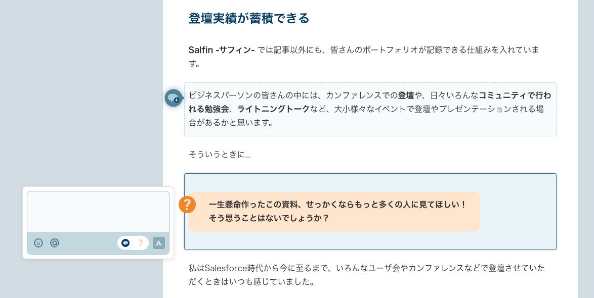 Salfinでは記事全体に対してのコメントだけではなく、Salfinでは記事内の“気になった箇所(ブロック)”に対してピンポイントでリアクションやコメント、質問ができます。