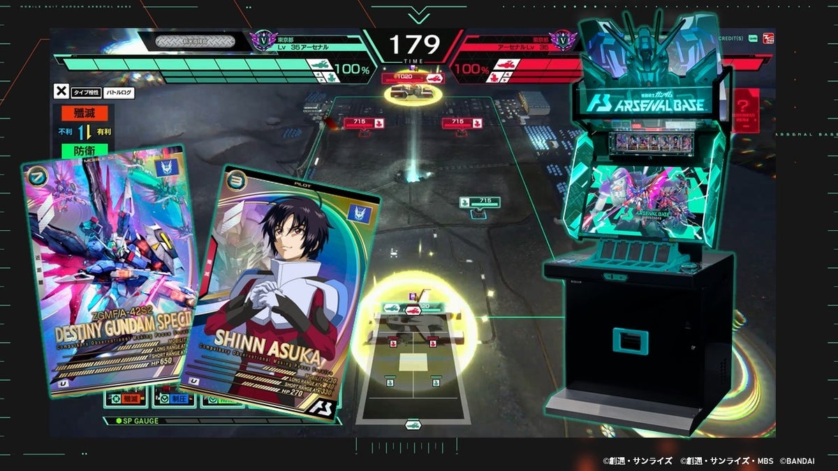「機動戦士ガンダム アーセナルベース」は、プレイヤーが指揮官となり5機のモビルスーツ+5体のパイロットを指揮し、敵戦艦の撃破を目指して戦うリアルタイムストラテジー型アーケードカードゲームです。カードゲームを遊ぶことに特化した大型タッチパネル筐体で、リアルタイムに変化する戦況に対しタッチ操作で部隊の指揮をとることができます。