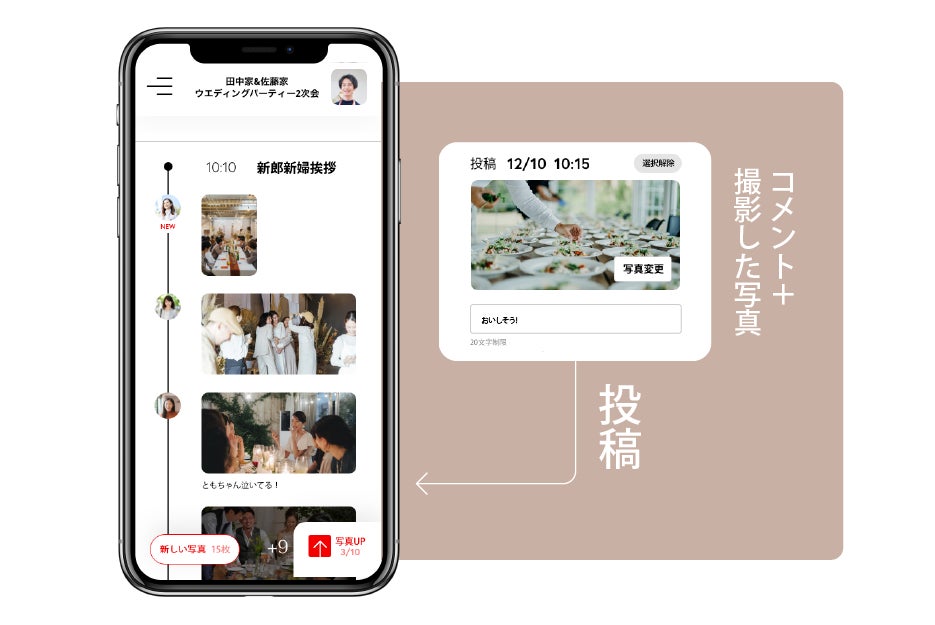 想い出アルバム:ゲストが撮影した写真をリアルタイムで投稿・共有できます。