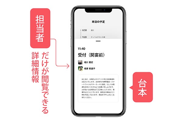 デジタル台本:司会者や担当者のスマホがデジタル台本に。開始時間、進行内容、担当者、合図のタイミングがすべてリアルタイムで共有されます。
