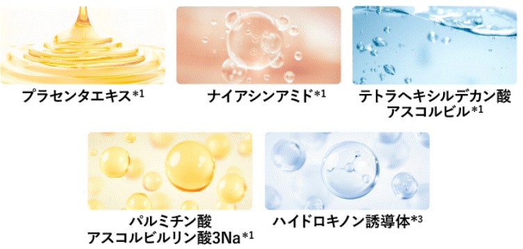 ⁺プラセンタエキス、ナイアシンアミド、テトラヘキシルデカン酸アスコルビル、パルミチン酸アスコルビルリン酸3Na、ハイドロキノン誘導体(a-アルブチン)(全て整肌) *¹ 整肌 *² 乾燥によるもの *³a-アルブチン (整肌)