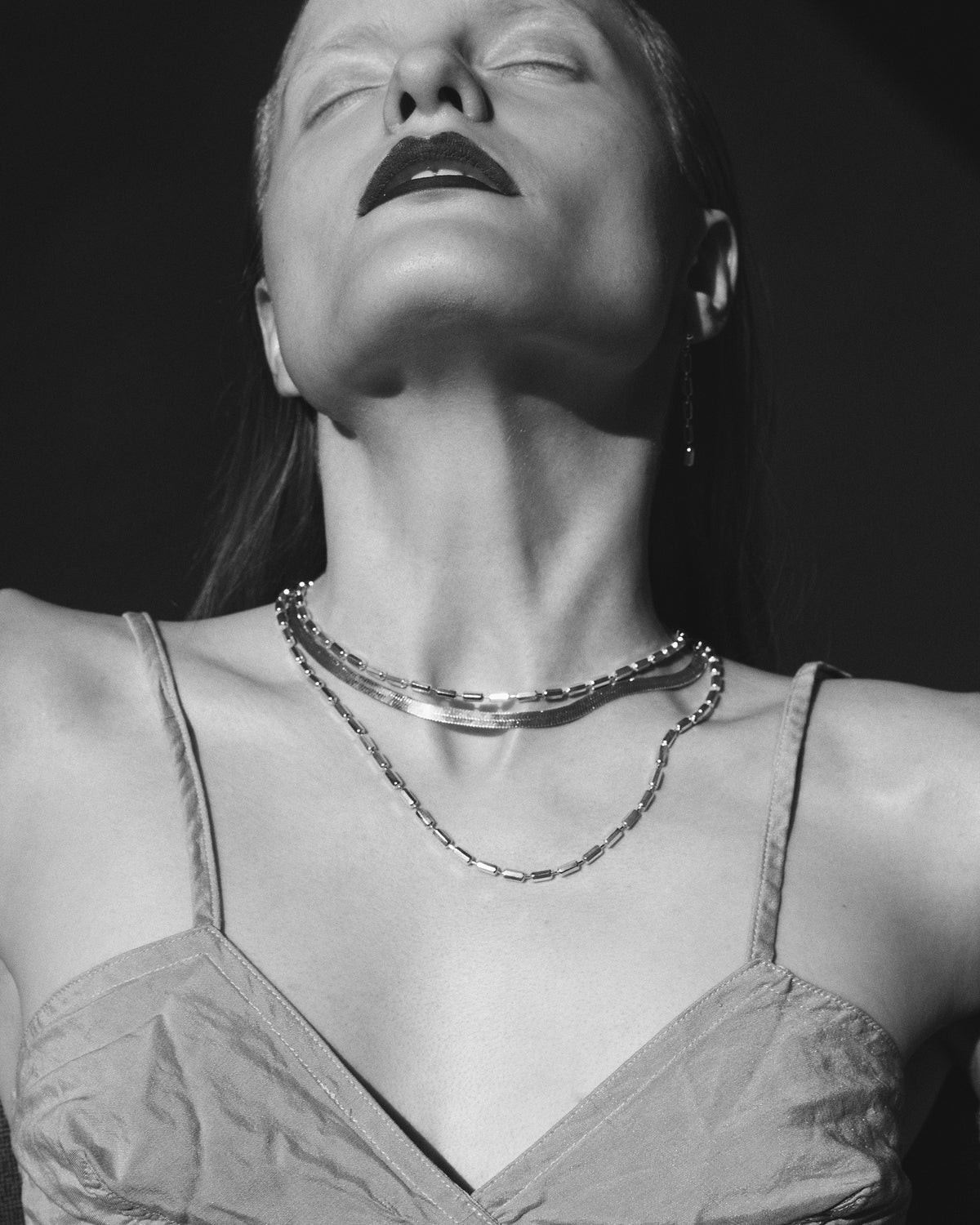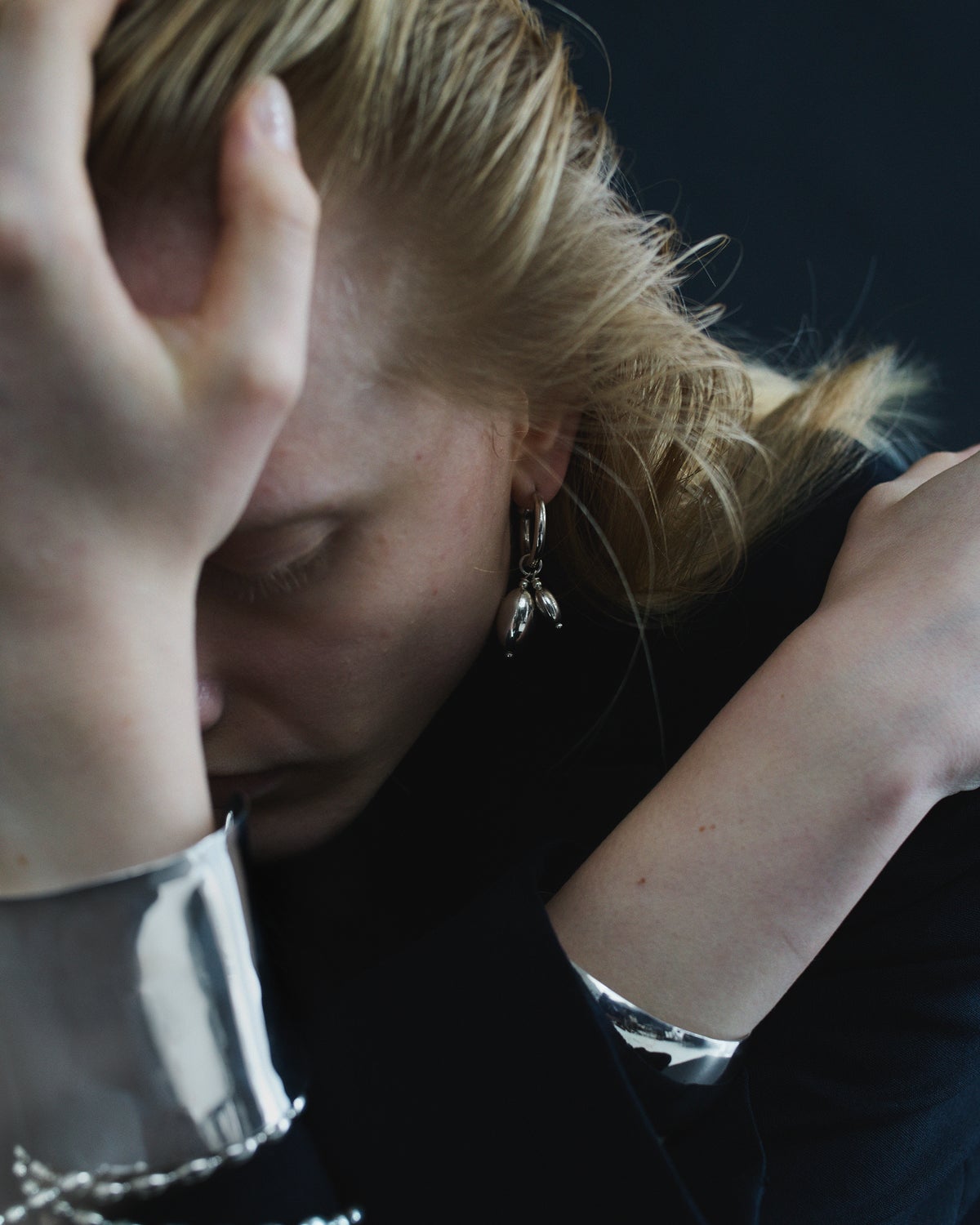 素肌のうえで光を受けて輝きを放つシルバーのテクスチャーが、顔周りをシャープでスタイリッシュにみせてくれます。