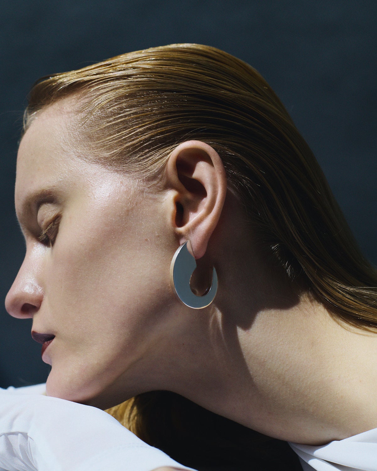 髪はタイトにまとめるか、耳にかけてすっきりと。光を受けるたびにフォルムが強調され、静かな存在感を放ちます。
