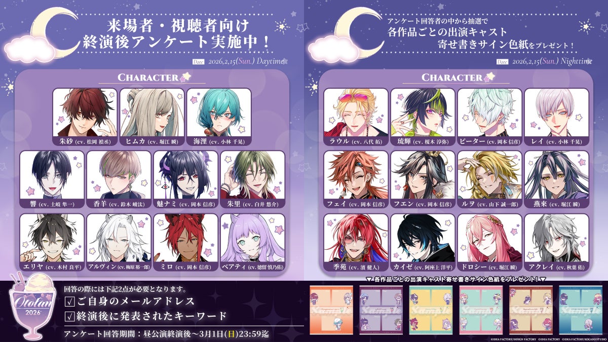 2月15日(日)に本公演が終了いたしました。「オトファン」ならではの、サブキャラクターを絡めた朗読劇や作品・キャラクターの“新たな魅力”を見出すファン参加型の企画コーナーはお楽しみいただけましたでしょうか……?
