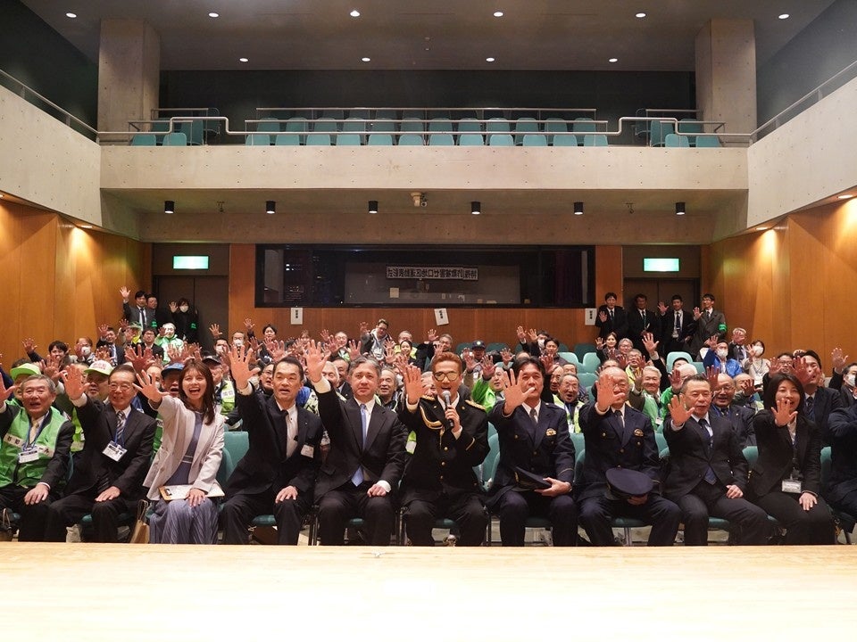 イベントの締めくくりには、県内の表彰地区代表者らと共に記念撮影を実施。ATSUSHI支援官のリードにより、富山弁で「特殊詐欺には、だまされんちゃー!」と力強く声を合わせ、地域一丸となって詐欺を撲滅する決意を新たにしました。