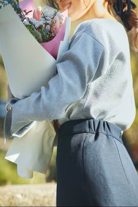山根さんの “好きの基本” である、『首が詰まり気味の袖ありブラウス』、『ミモレ丈タイトスカート』 に立ち返った、山根さんらしいアイテムが完成しました。