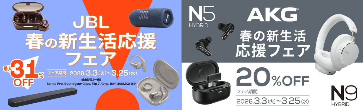 アメリカ カリフォルニア発祥の世界最大級のオーディオブランド「JBL」を擁するハーマンインターナショナル株式会社(本社:東京都千代田区、代表取締役:桑原拓磨)は、2026年3月3日(火)~3月25日(水)の期間限定で人気のワイヤレスイヤホンやポータブルスピーカー、サウンドバーを最大31%オフで購入できる「春の新生活応援フェア2026」を開催いたします。