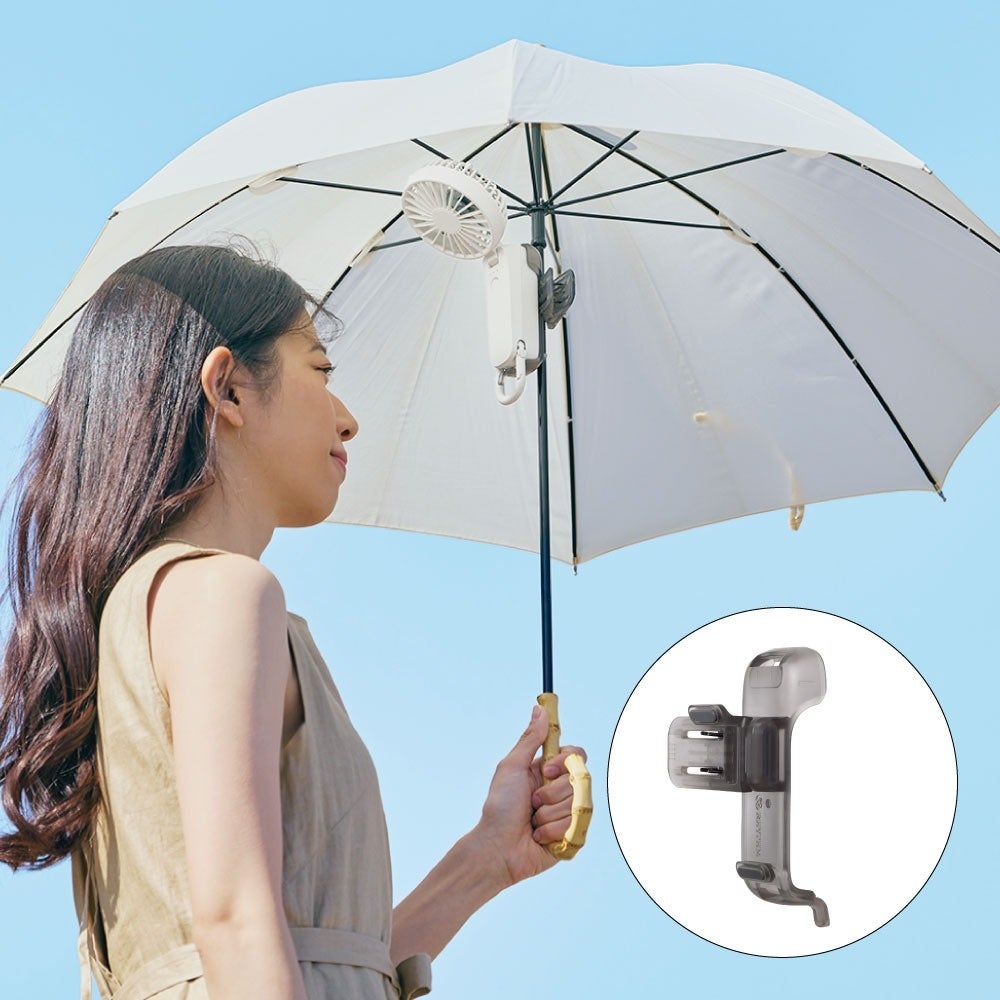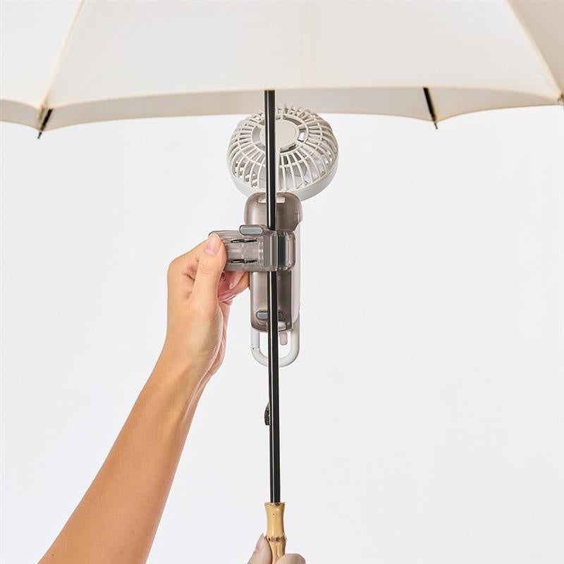 日傘使用時に、ハンディーファンを手で持たずに使いたいというニーズに応えたクリップ。素早く着脱でき、ずれにくい構造に設計。ファンの角度を調整すれば、真下から、真上からとお好きな場所から風を当てることができます。