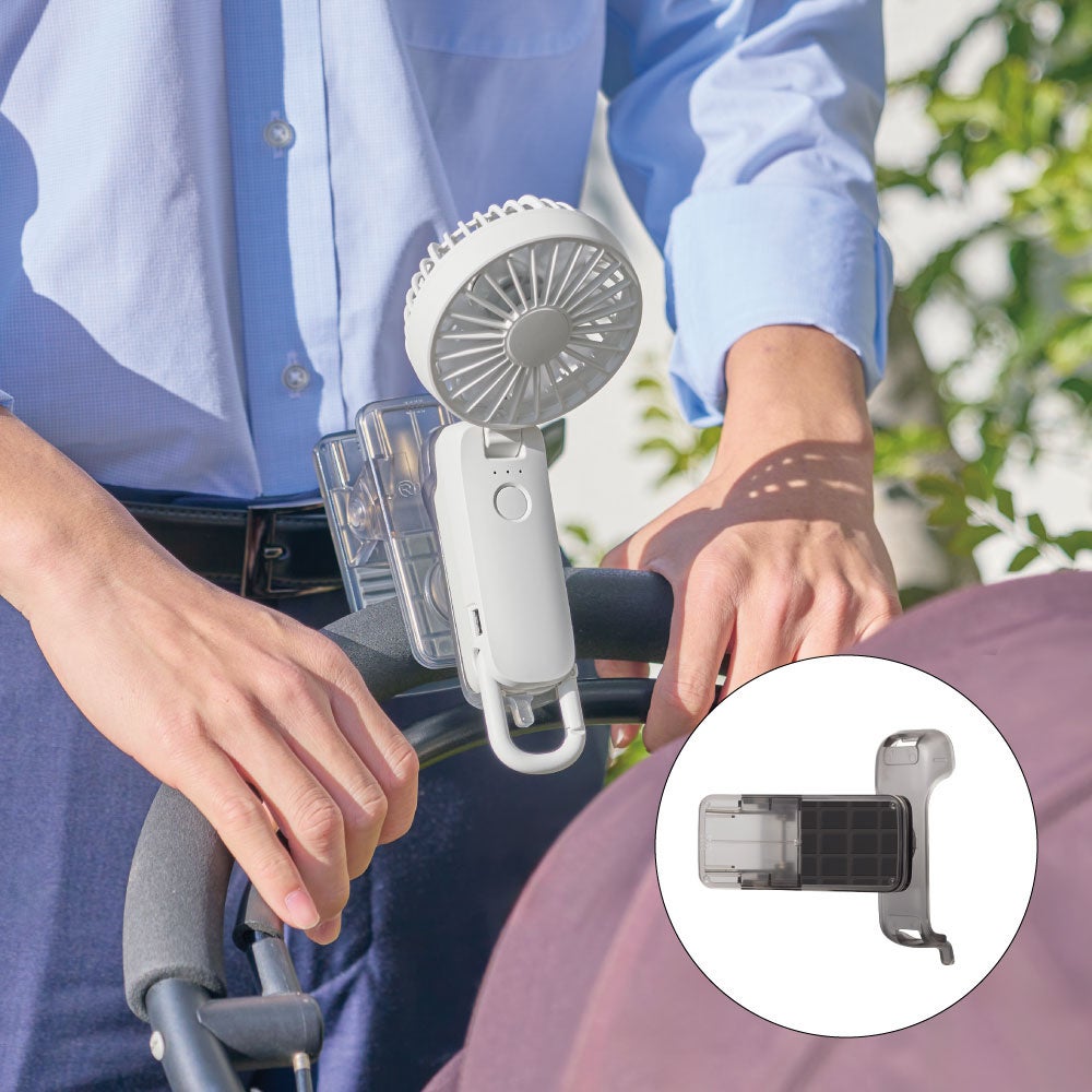 クリップ部が360度回転し、さまざまな方向にハンディファンを固定する事が可能なため、ファンの向きを狙った所に合わせる事ができます。ずれにくい構造で、ベビーカーやペットカート、テーブル、家具の縁など、さまざまな場所に取り付けて使用できます。ベビーカーやペットカート使用時に両手がふさがってしまう場面や、置き場に困る場面でも、位置を固定してハンズフリーで風に当たることができます。テーブルの上がものでいっぱいになる作業中や食事中は、テーブル縁に取り付けて、入浴後やメイク中に洗面所の棚やポールに取り付けて。屋内外を問わず、使用シーンは無限大です。