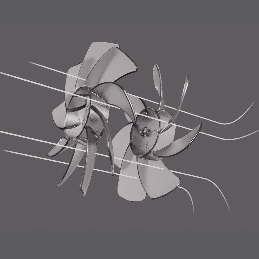 2重反転ファンイメージ 後ろの羽根で空気を集め、前の羽根で筒状の風を届けます。