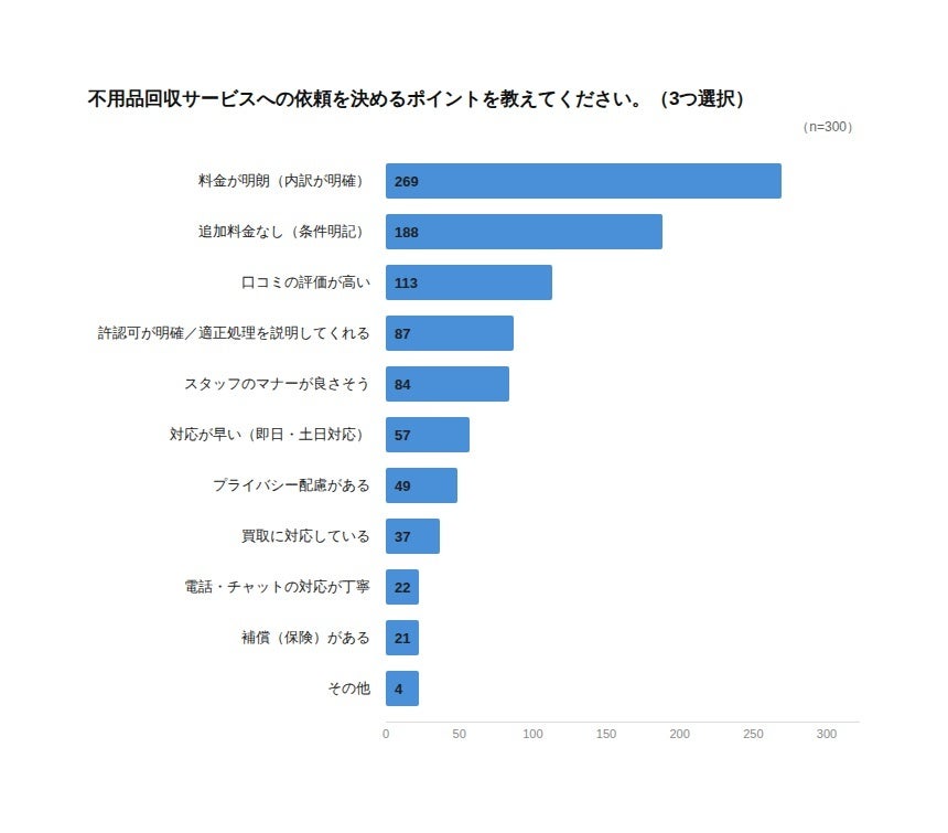 不用品回収サービスの依頼を決めるポイント(3つ選択)では、「料金が明朗(内訳が明確)」が269回答(89.7%)と断トツの1位となりました。2位「追加料金なし(条件明記)」188回答(62.7%)、3位「口コミの評価が高い」113回答(37.7%)を大きく引き離しており、消費者が何より料金の透明性を重視していることが数字からも明確に示されています。