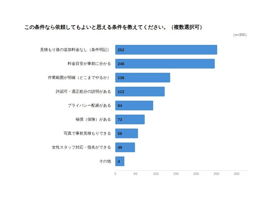 また、依頼前にあると安心できる情報(3つ選択)でも、「見積もりの内訳(作業費・処分費・オプション)」240回答(80.0%)、「追加料金が発生する条件の明記」209回答(69.7%)、「料金の目安表(量・間取り別など)」191回答(63.7%)とトップ3がすべて料金関連でした。