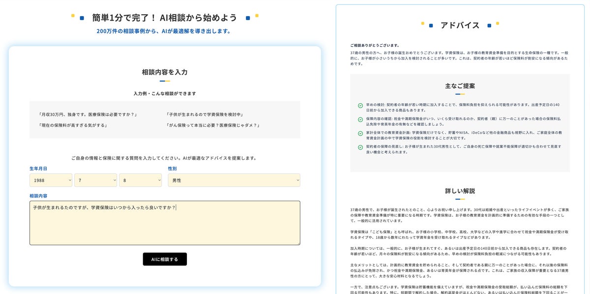 1.AI保険相談(24時間対応) AIが、生年月日、性別、相談内容から保険の悩みに回答します。「200万件の相談事例から、お客様にとって必要な保障」を提案します。