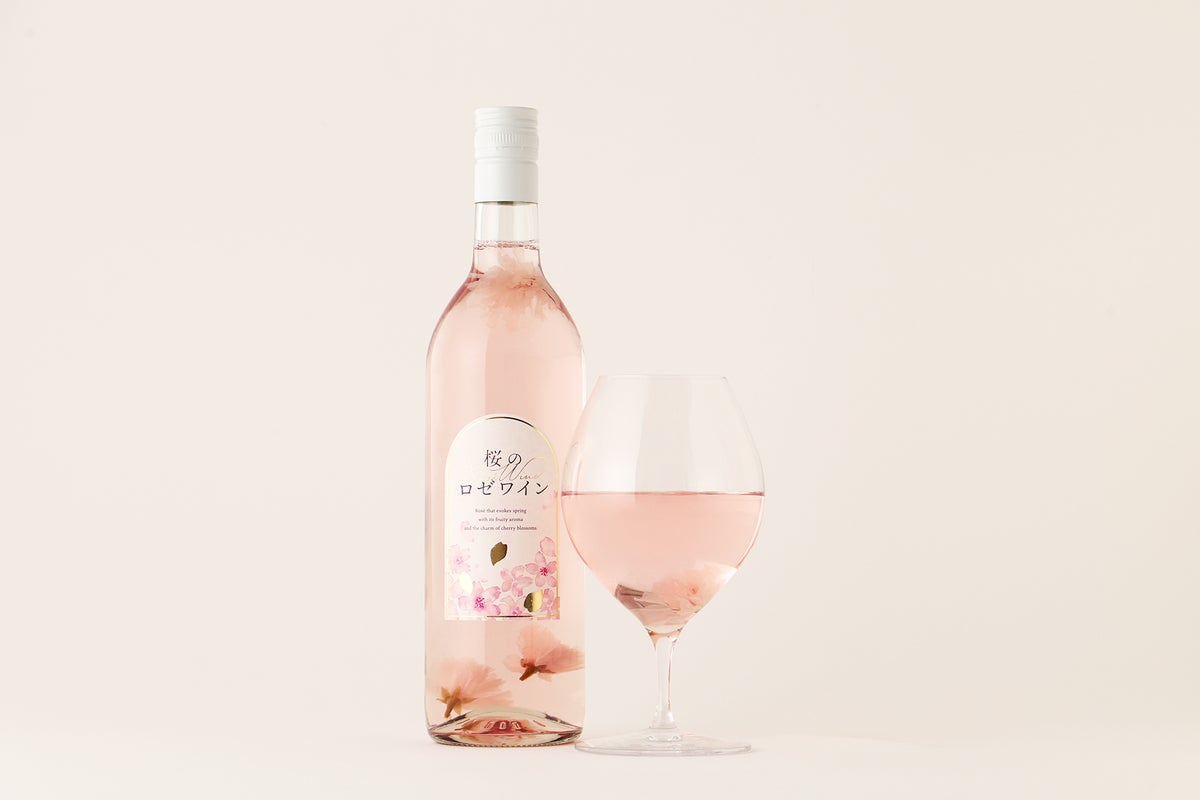 「桜のロゼワイン」は、ボトルの中に本物の桜の花が入ったロゼワインです。原料には山梨県産のぶどうを100%使用しています。白ぶどうの「甲州」と黒ぶどうの「マスカット・ベーリーA」をブレンドし、日本生まれの品種にこだわって造りました。透明なボトルの中で桜の花が舞う様子を視覚的に楽しむことができるため、お祝いの席や贈り物としてもぴったりです。