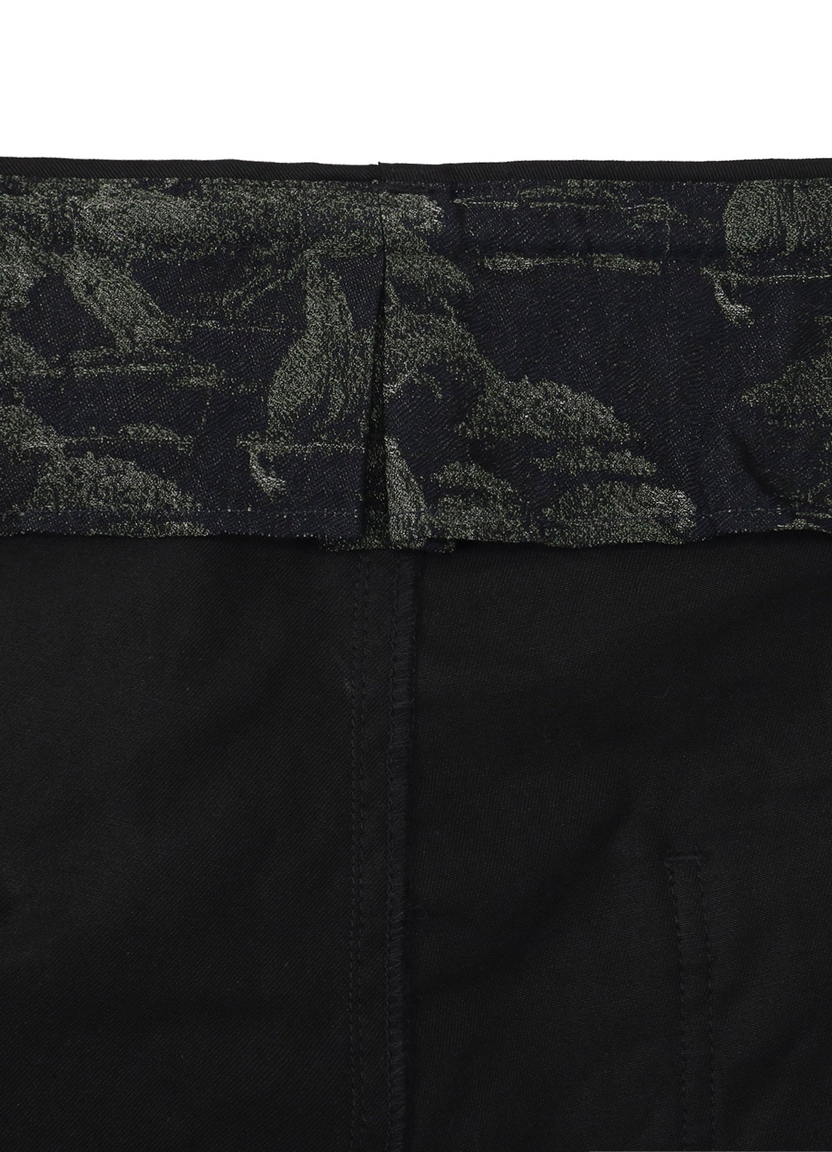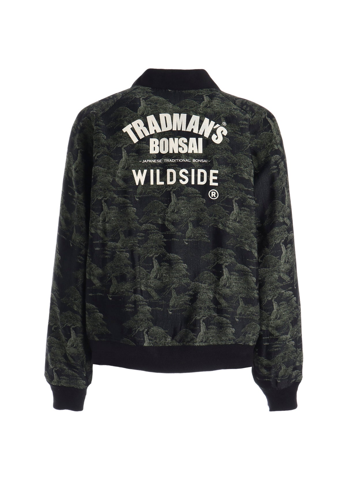 リバーシブルブルゾンは、背面に五葉松模様木-銘「501」をグラフィカルなデザインに変え、モノトーン調で大胆に刺繍を施しました。裏地には、五葉松、黒松、真栢模様木といったTRADMAN’S BONSAIが誇る名株をコラージュし、ジャガード織によって構築された総柄で、一見迷彩柄のようにも映るユニークなテキスタイルデザインに仕上げています。