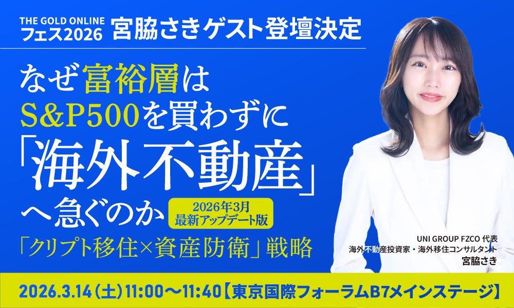 富裕層向け資産コンサルティングおよび海外移住支援を手がけるUNI GROUP FZCO(本社:ドバイ、代表:宮脇さき)は、2026年3月14日(土)開催の資産運用総合イベント「THE GOLD ONLINEフェス2026」にブース出展することをお知らせいたします。また、当社代表で資産運用の専門家である宮脇さきが、同イベント内のセミナーに登壇予定です。