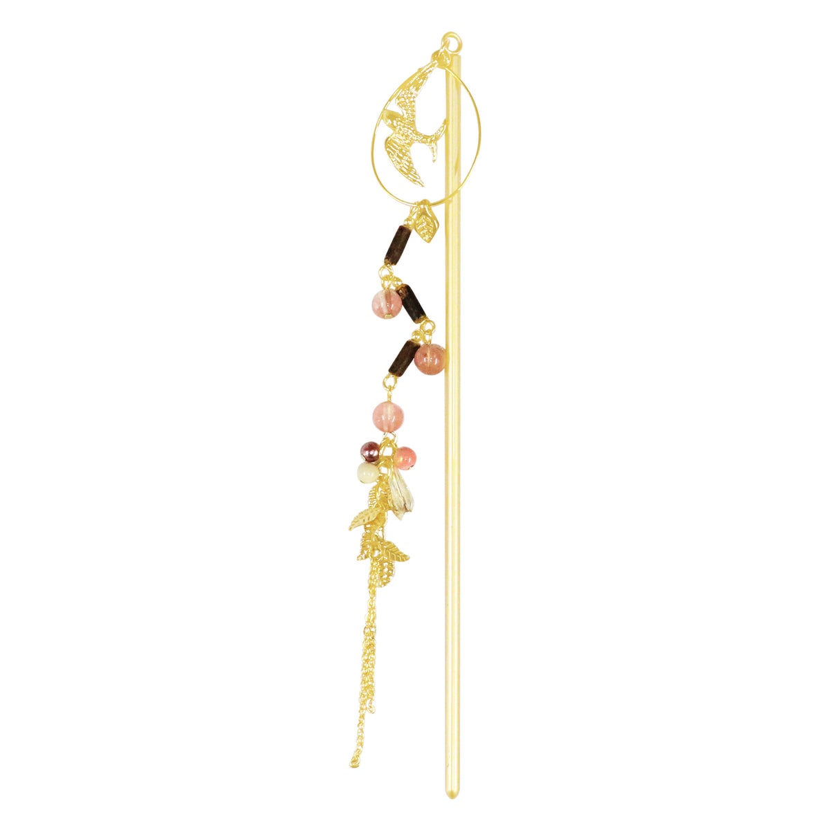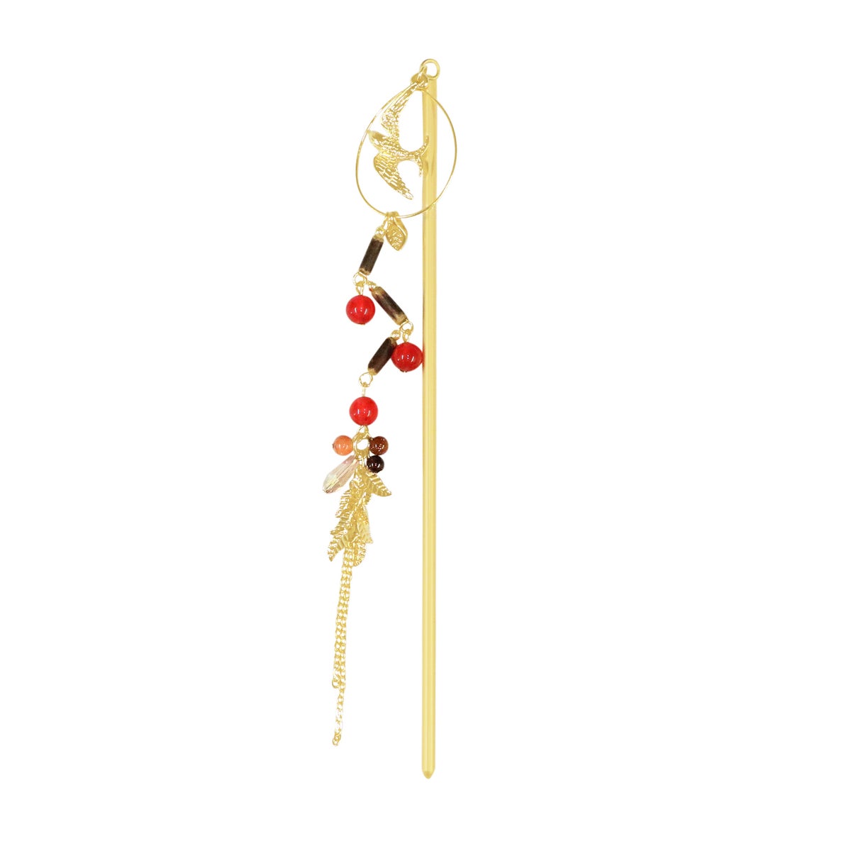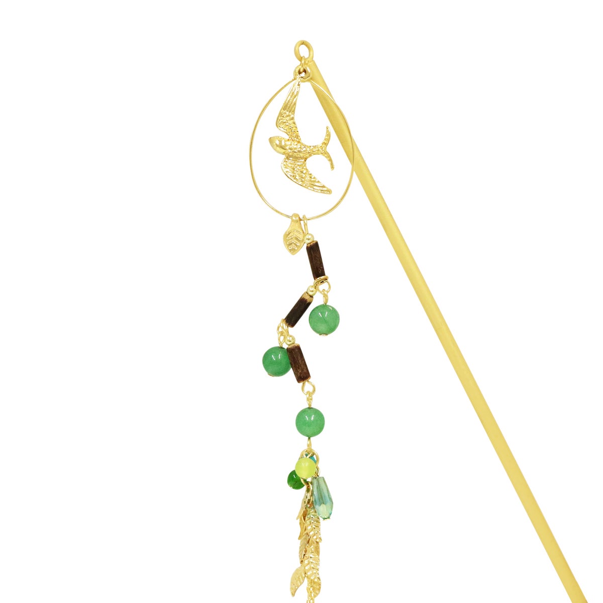 広大な森を抜け、次なる目的地へと羽ばたく渡り鳥をモチーフにした簪が登場。フープの中で翼を広げるツバメは自由の象徴。連なる木製ビーズは深い森を、艶やかな丸ビーズは旅の中で見つけた森の恵みを表現しています。