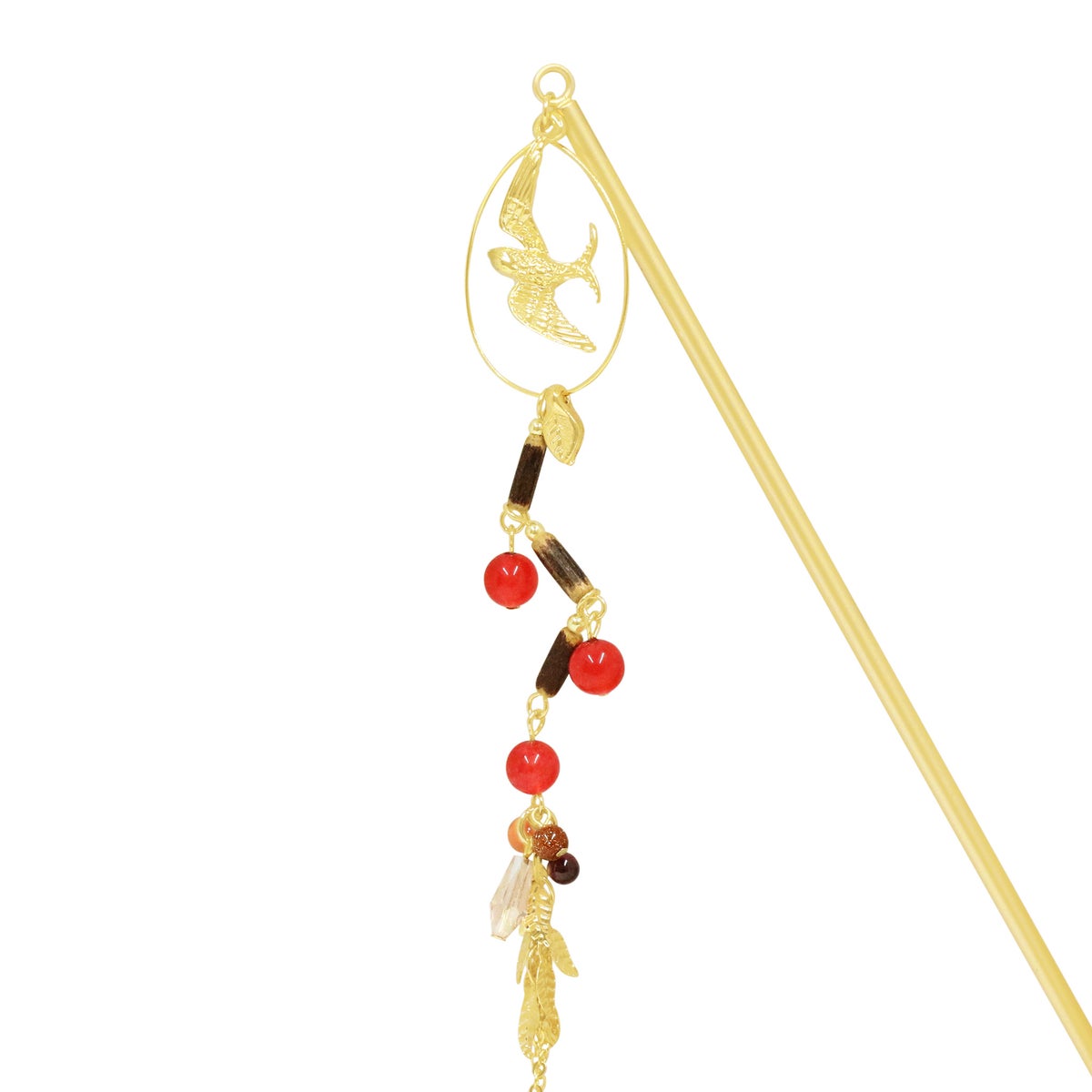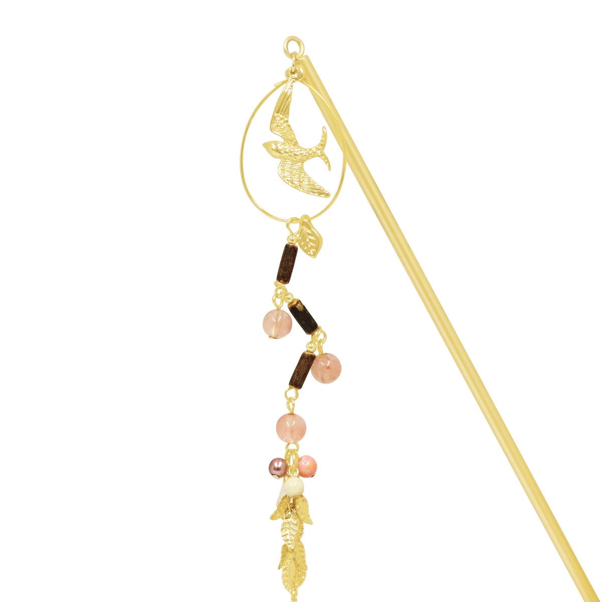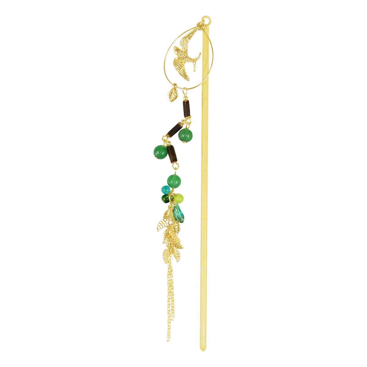 広大な森を抜け、次なる目的地へと羽ばたく渡り鳥をモチーフにした簪が登場。フープの中で翼を広げるツバメは自由の象徴。連なる木製ビーズは深い森を、艶やかな丸ビーズは旅の中で見つけた森の恵みを表現しています。