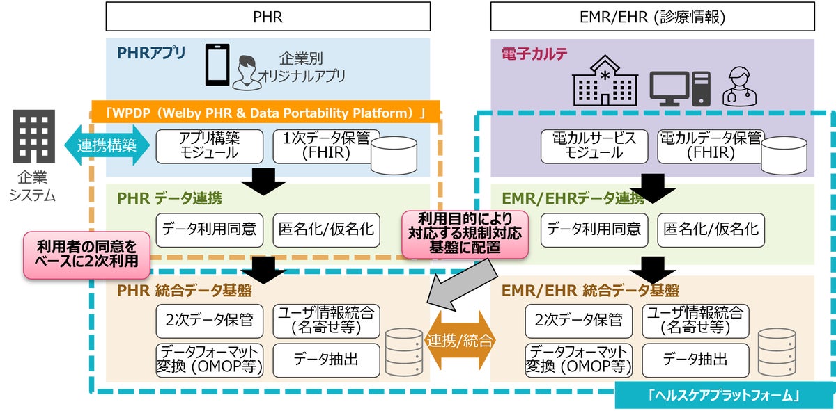 - Welbyの医療情報・健康情報などのデータ収集機能に関するアセット/知見と、TISの標準化/接続に関する技術/知見を活用することで、電子カルテなど外部システムとの連携を実現。さらに、Welbyの「WPDP(Welby PHR & Data Portability Platform)」とTISの「ヘルスケアプラットフォーム」の連携により、PHR/EHR/EMRが一体となり、製薬会社向け治験・臨床研究ソリューションや、保険会社向けヘルスケアデータソリューションを強化。