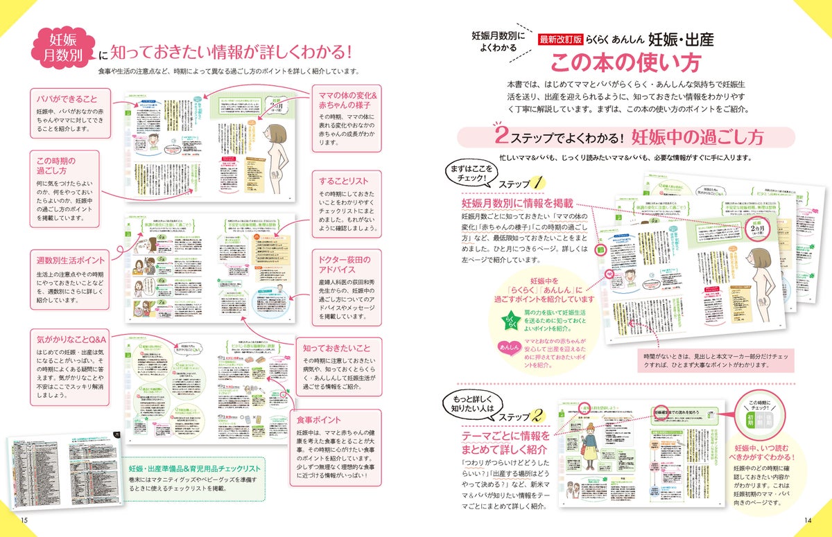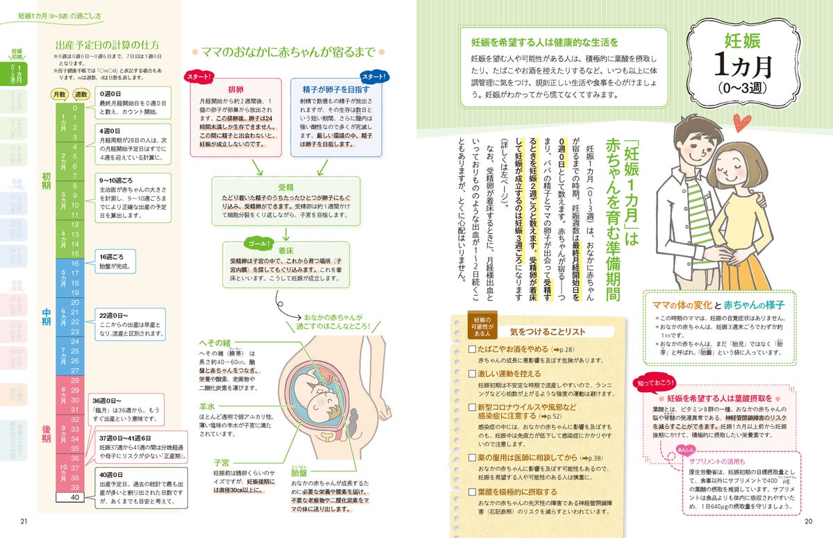 漫画「コウノドリ」の主人公のモデルとなった産科医が監修。妊娠1カ月から出産まで、母親の体の変化、赤ちゃんの様子、家族にできることなどを、月数ごとに解説。子ども・子育て支援法、育児・介護休業法の改正などに合わせて新たな情報を盛り込み、産休・育休制度を最大限に活用する方法や、もらえるお金・自治体のサポートなど、働く女性の妊娠・出産にまつわる最新情報も紹介します。妊娠中に気をつけたい感染症&ワクチン、妊娠中に摂りたい栄養などの情報もアップデート。